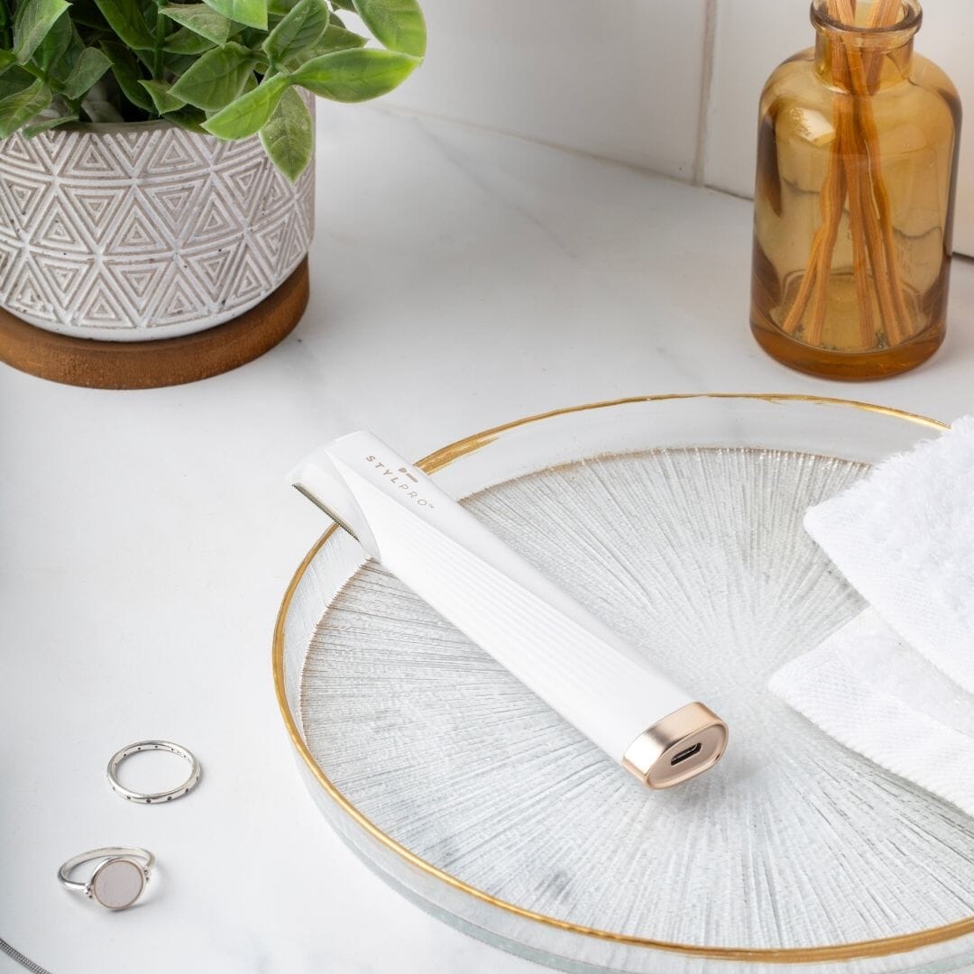 WARNING: TO REDUCE THE RISK OF BURNS, ELECTROCUTION, FIRE, OR INJURY TO PERSONS: READ ALL INSTRUCTIONS BEFORE USING THE APPLIANCE. This product should not be used by; children, pregnant women, patients with epilepsy, tumors and cancer patients, patients with cardiac pacemakers or similar. DO NOT USE the sonic dermaplane ON UNINTENDED AREAS OF THE BODY INCLUDING ON SURFACE OF LIPS, NOSE AND EYELIDS. THIS DEVICE IS DESIGNED ONLY FOR USE ON THE FACE, CHIN AND neck area. Remove , glasses, false eyelashes and contact lenses before use. If you feel abnormalities in your skin during use or after use, please consult your medical specialist. TO PROTECT AGAINST ELECTRICAL HAZARDS, DO NOT USE WHILE BATHING OR IN THE SHOWER. CLOSE SUPERVISION IS NECESSARY WHEN ANY APPLIANCE IS USED BY OR NEAR CHILDREN OR PERSONS MADE WEAK OR DISABLED BY ILLNESS OR INJURY. Do not use on sensitive or broken skin. Do not use on swollen or sunburnt skin or if you have any other skin conditions. DO NOT OPERATE THIS APPLIANCE IF THE APPLIANCE MALFUNCTIONS OR HAS BEEN DROPPED OR DAMAGED IN ANY MANNER. RETURN APPLIANCE TO NEAREST SERVICE FACILITY FOR EXAMINATION, ELECTRICAL OR MECHANICAL ADJUSTMENT, OR REPAIR. NO REPAIRS SHOULD BE ATTEMPTED BY THE CONSUMER. USE APPLIANCE ONLY FOR INTENDED USE AS DESCRIBED IN THIS INSTRUCTION BOOK. THE USE OF ATTACHMENTS NOT RECOMMENDED BY STYLPRO™ MAY CAUSE HAZARDS. DO NOT USE OUTDOORS OR OPERATE WHERE AEROSOL (SPRAY) PRODUCTS ARE BEING USED, OR WHERE OXYGEN IS BEING ADMINISTERED. Do not place any part of the product near heat sources such as radiators, cookers, etc do not lay on a soft surface such as a bed as device may overheat. Keep the device away from corrosive liquids. ENSURE DEVICE IS ‘OFF’ BEFORE STORAGE. DO NOT USE APPLIANCE IN THE BATHROOM OR NEAR WATER. DO NOT PLACE OR STORE APPLIANCE WHERE IT CAN FALL OR BE PULLED INTO A TUB OR SINK. DO NOT PLACE IN OR DROP INTO WATER OR OTHER LIQUIDS. IF THE APPLIANCE FALLS INTO WATER, DO NOT REACH INTO THE WATER. CHOKING HAZARD DUE TO SMALL PARTS. NOT SUITABLE FOR CHILDREN UNDER 3 YEARS. Do not share this product with anyone else. Please do not use during charging. Inspect the device for any damage before each use. Consult with a dermatologist or healthcare provider if you have sensitive skin, a history of skin conditions, or are uncertain about the suitability of this product for your skin type. DO NOT REUSE A blade. FOR HYGIENE, SAFETY, AND BEST RESULTS ALWAYS USE A NEW blade. DISCARD blade DIRECTLY INTO WASTEBASKET AFTER USE AND PLACE DERMAplane IN CHARGING BASE. ENSURE blade TRAY IS ON FLAT SURFACE WHEN LOADING DEVICE WITH NEW blade. DO NOT USE ON ACTIVE ACNE, PSORIASIS, ROSACEA, OPEN SORES, SKIN WITH A RASH, SUNBURNED OR DISTRESSED SKIN OR ON SKIN SURFACES WHERE CUTS, ABRASIONS OR ANY KIND OF HEALING IS PRESENT. DO NOT USE DEVICE OR ON MOLES, CANCEROUS AREAS OR LESIONS OR ON SKIN WHICH HAS RECENTLY BEEN TREATED WITH A LASER OR RECENTLY CHEMICALLY TREATED.