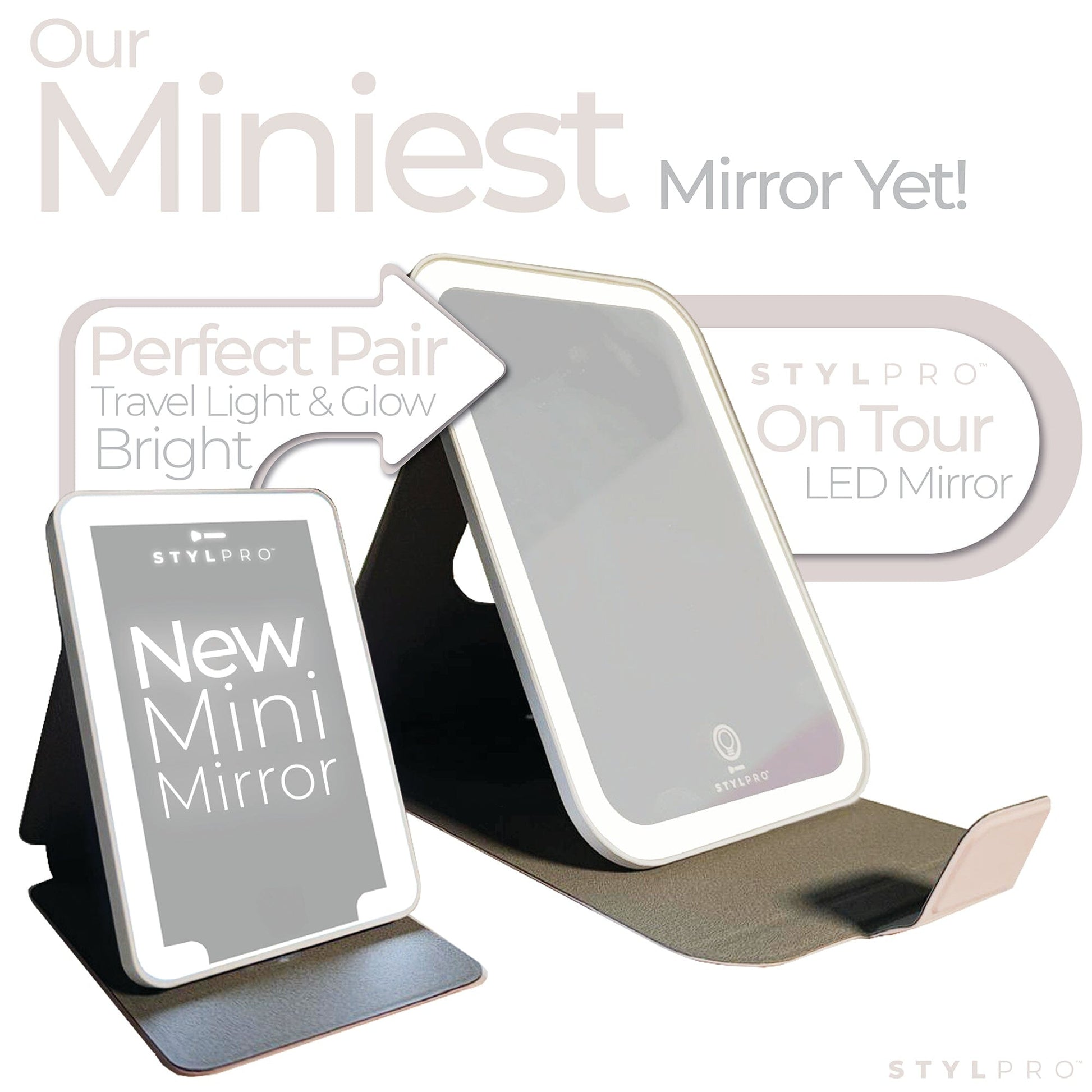 The STYLPRO Mini Mirror is a compact, portable mirror with an LED light strip for a clear, bright reflection wherever you go.