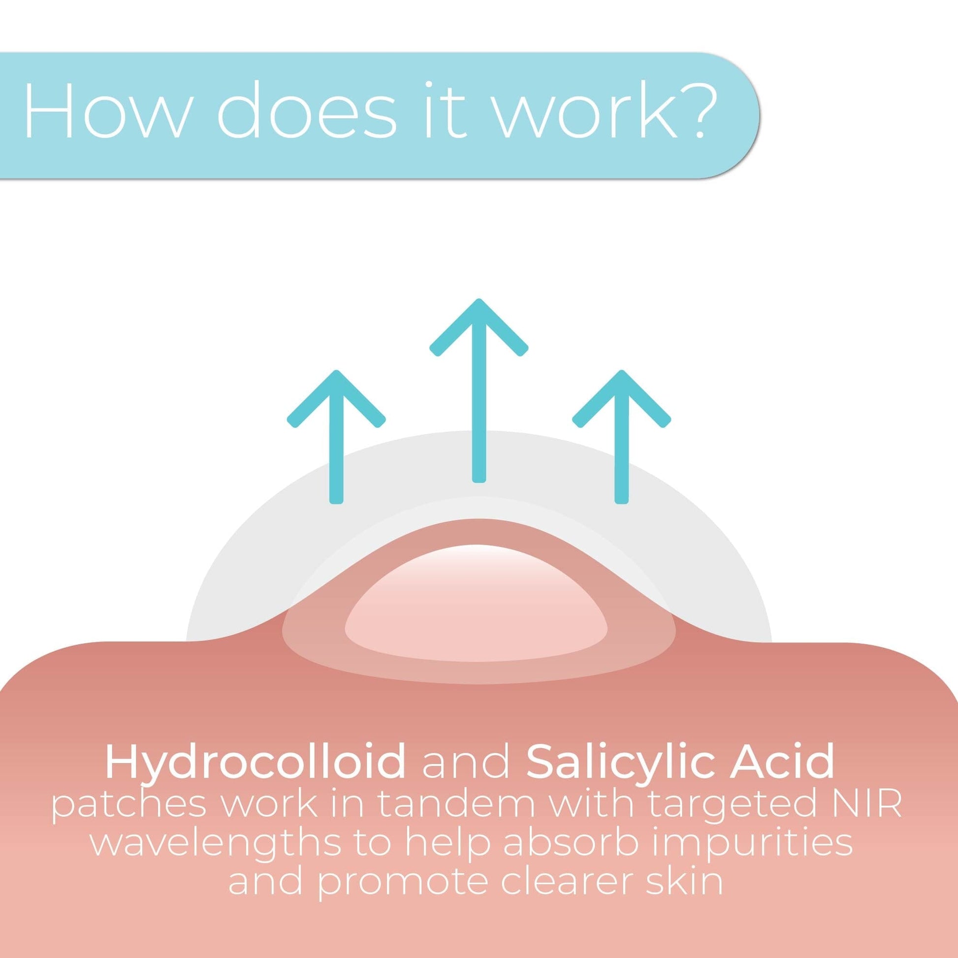 The LED device uses 6x Blue (415nm) and 6x Near Infrared (830nm) lights to target blemishes, while the Hydrocolloid & Salicylic Acid patches absorb gunk and protect your skin.