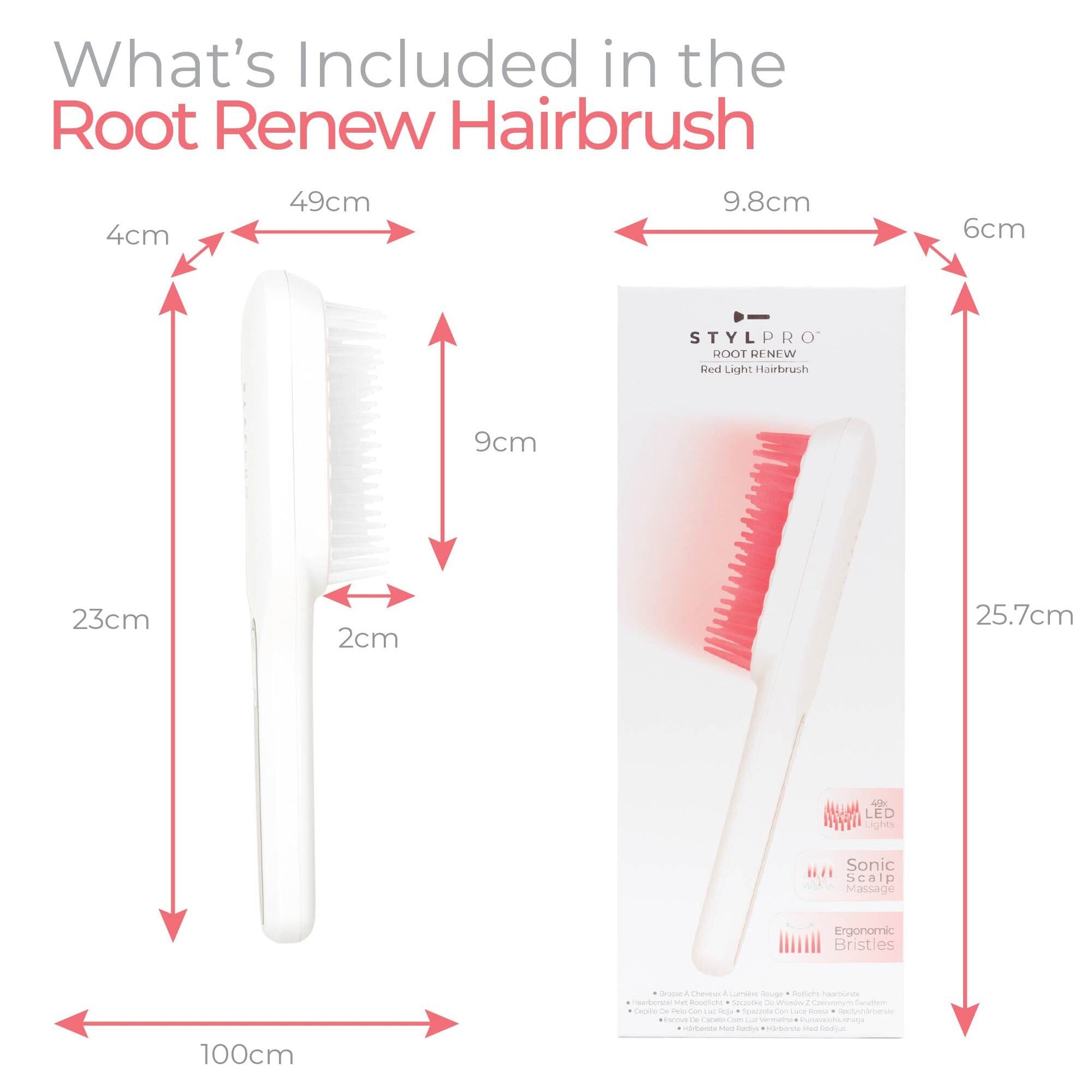 The STYLPRO Root Renew Red Light Hairbrush is an innovative hair care device that uses 655nm red light and 830nm deep red light technology and massaging vibrations to help support scalp and hair health from root to tip.